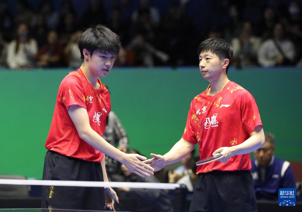 3月23日,北京八喜队组合马龙/黄友政(左)在比赛中击掌。他们3比0战胜广东队组合周启豪/袁烜松。