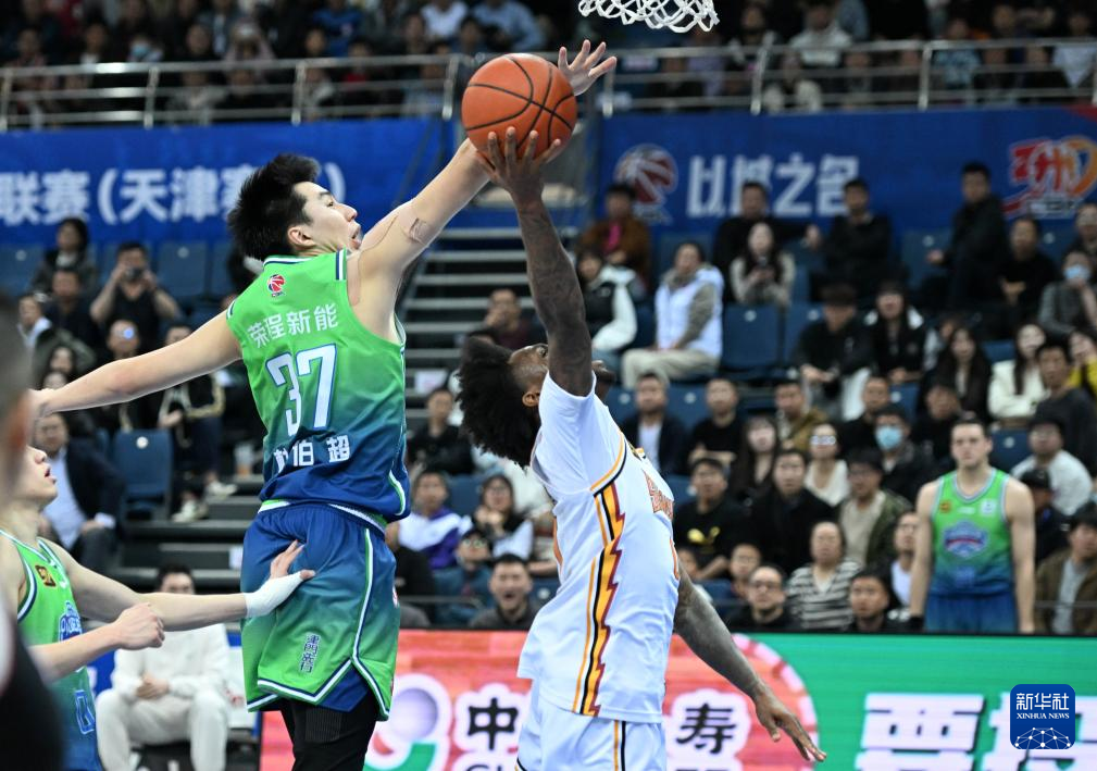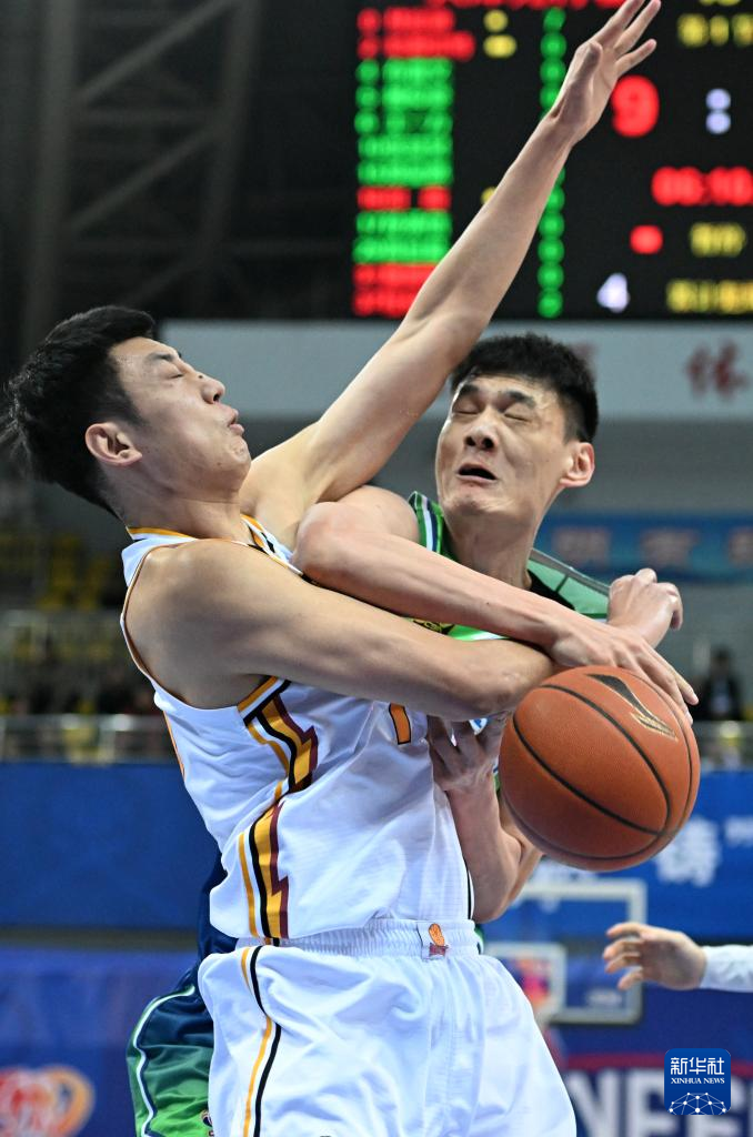 3月27日,天津先行者队球员田雨(右)和山西汾酒队球员焦海龙在比赛中拼抢。
