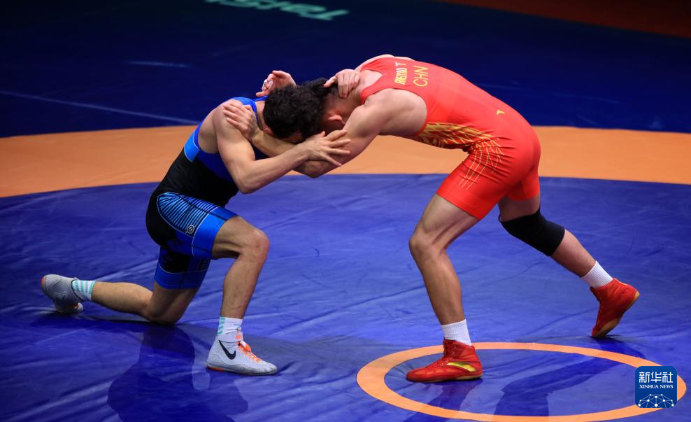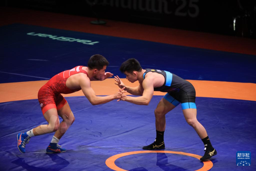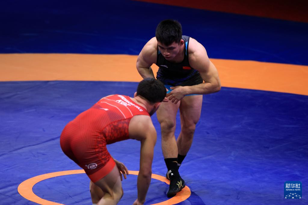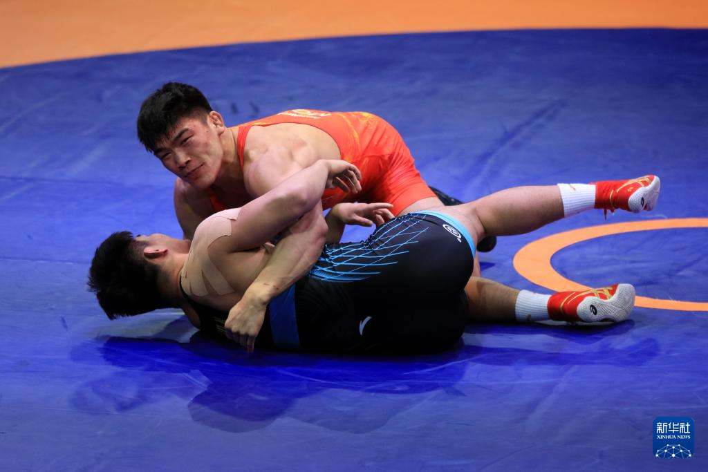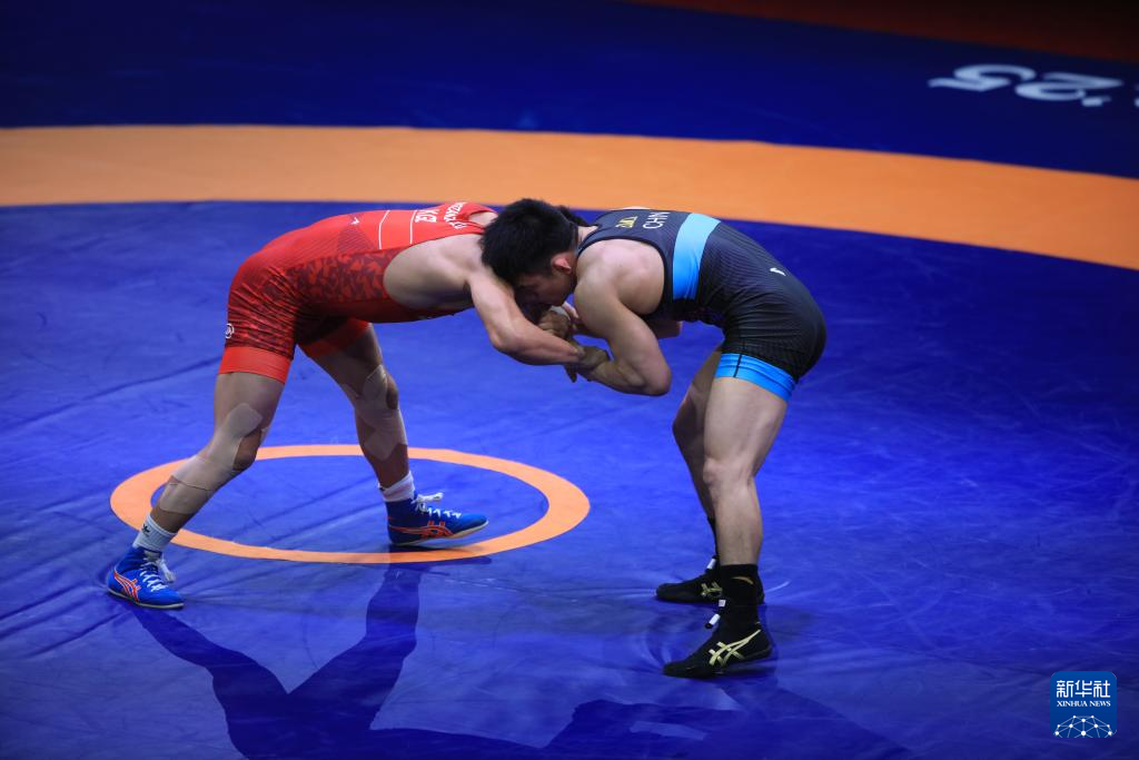 3月30日,中国选手阿黑由(右)在男子自由式摔跤74公斤级比赛中,最终他获得该项目季军。