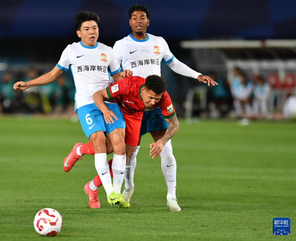 4月1日,青岛西海岸队球员徐彬(左)、马特乌斯(右)与河南俱乐部酒祖杜康队球员费利佩·卡多索在比赛中拼抢。