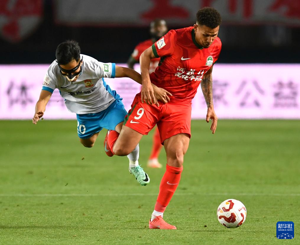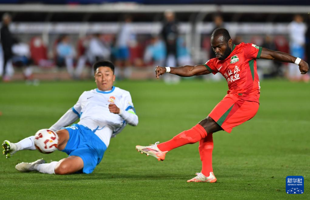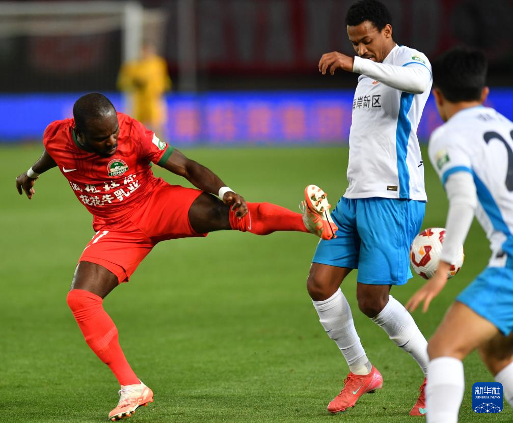 4月1日,河南俱乐部酒祖杜康队球员费利佩·卡多索(右)与青岛西海岸队球员何龙海在比赛中拼抢。