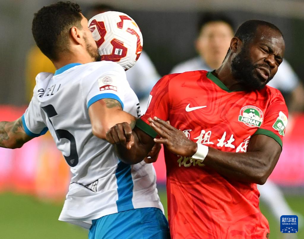 4月1日,河南俱乐部酒祖杜康队球员阿奇姆彭(右)与青岛西海岸队球员里切利在比赛中拼抢。