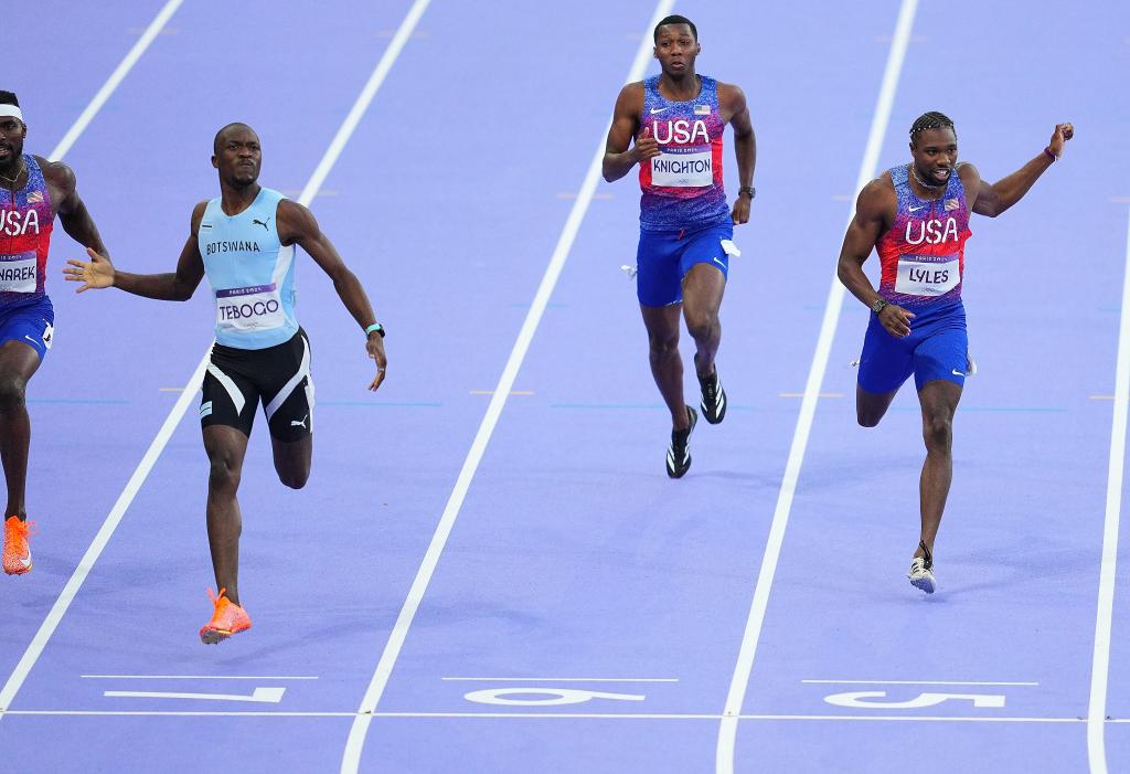 2024年8月8日,巴黎奥运会田径男子200米决赛,冠军博茨瓦纳选手特博戈(左二)、亚军美国选手贝德纳雷克(左一)、季军美国选手莱尔斯(右一)在比赛中。新华社记者 许畅 摄