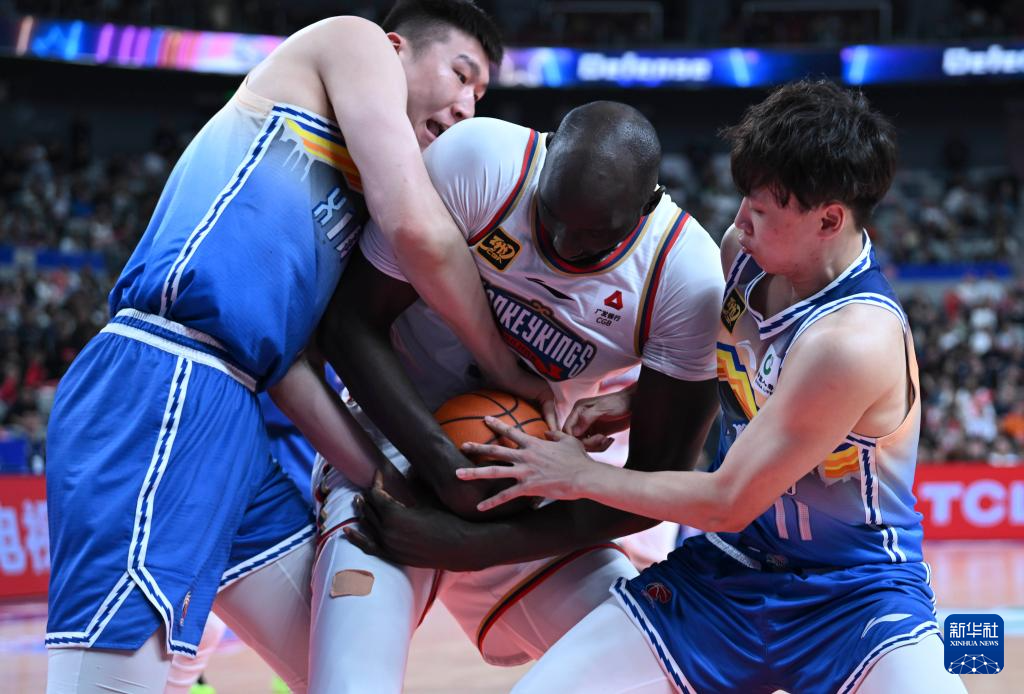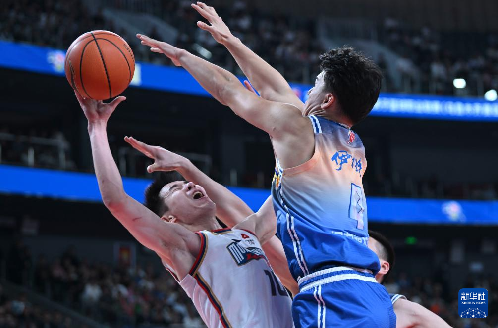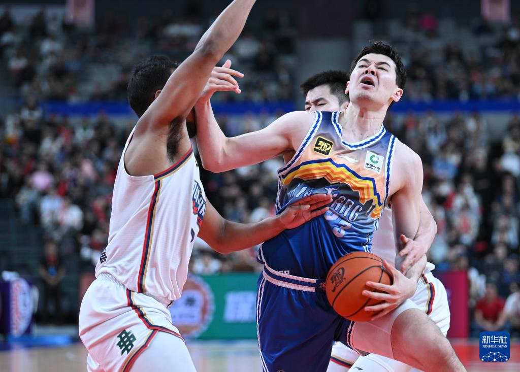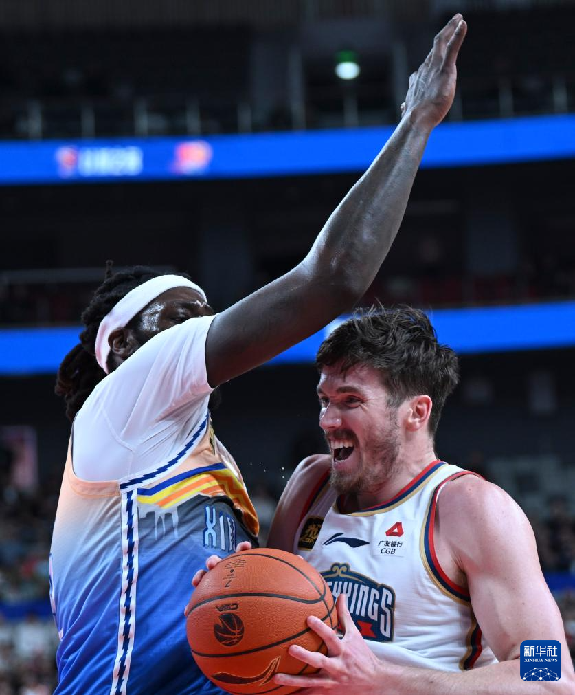 4月4日,新疆伊力特队球员劳森(右)与南京头排苏酒队球员郭昊文在比赛中拼抢。
