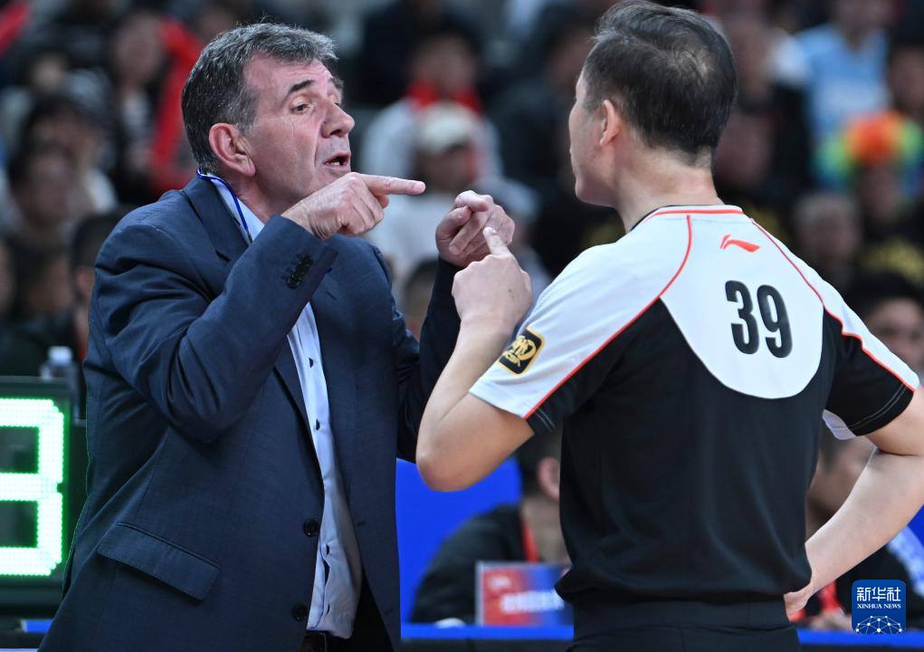4月4日,南京头排苏酒队主教练贝西洛维奇(左)在比赛中与裁判员沟通。