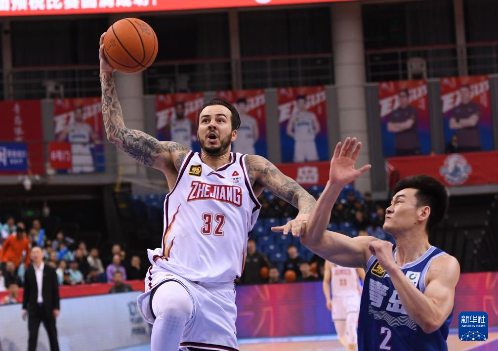 4月4日,浙江稠州金租队球员约克(左)在比赛中上篮。
