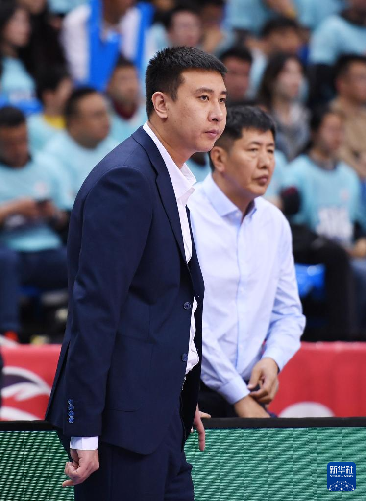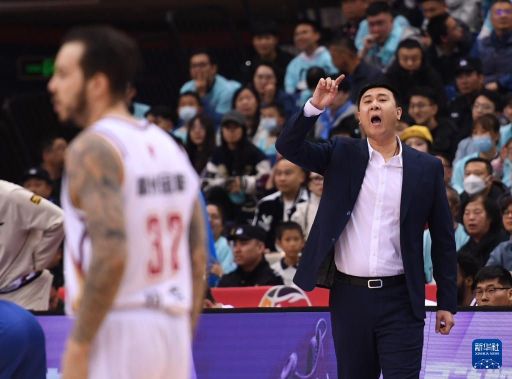 4月4日,浙江稠州金租队主教练鞠鹏(右)在场边指挥。