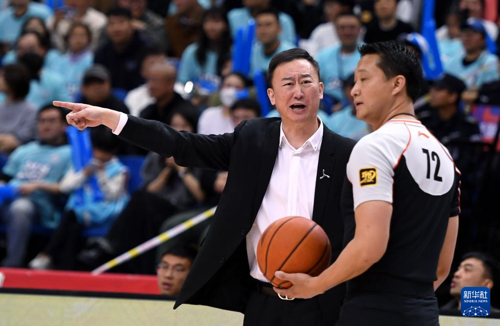 4月4日,青岛国信制药队主教练刘维伟(左)在比赛中与本场比赛主裁判张志伟交流。