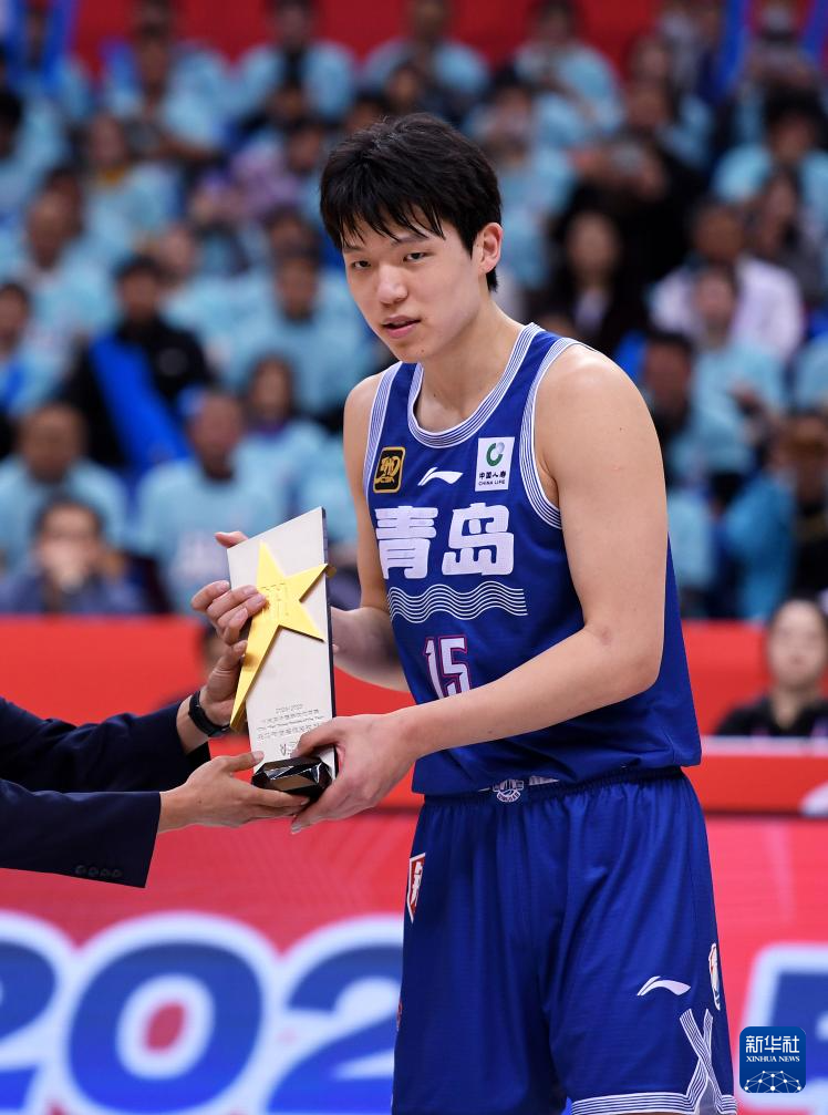 4月4日,青岛国信制药队球员杨瀚森在比赛前接过“年度最佳星锐球员”奖杯。