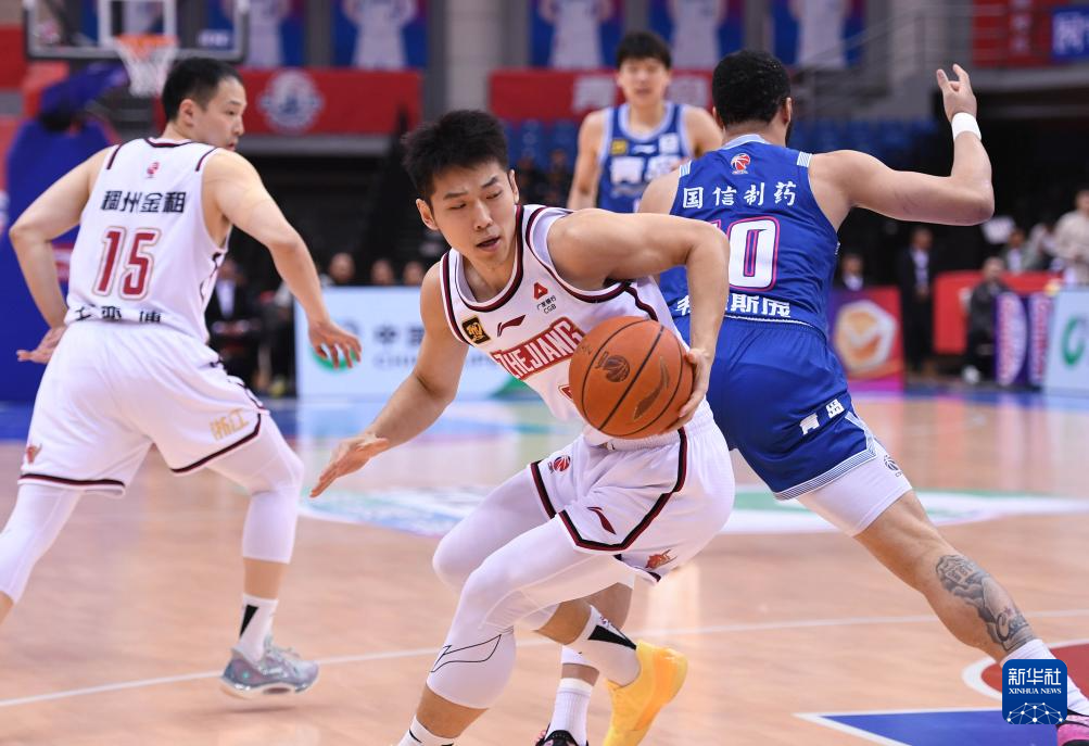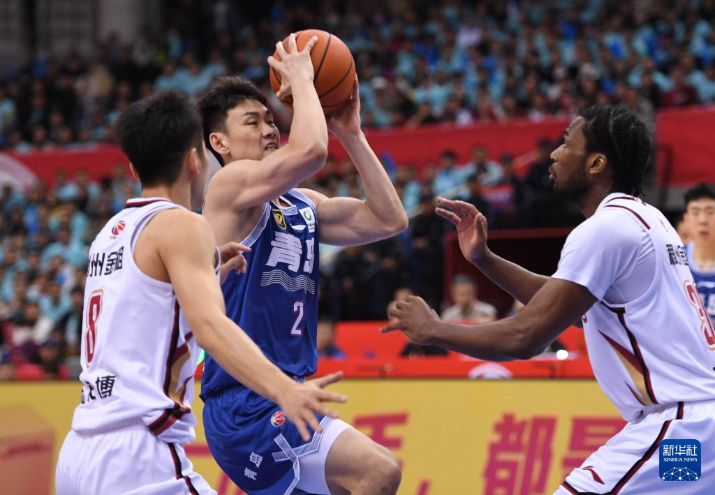 4月4日,青岛国信制药队球员王睿泽(中)在比赛中突破。