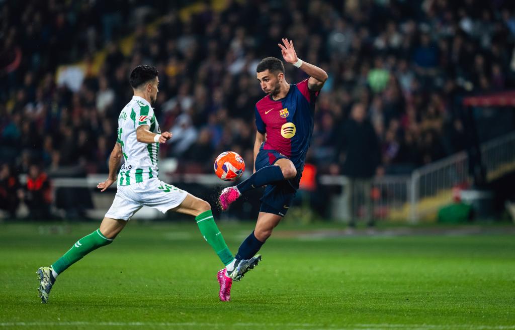 4月5日,巴塞罗那队球员费兰·托雷斯(右)与皇家贝蒂斯队球员巴尔特拉在比赛中拼抢。新华社发(胡安·戈萨摄)