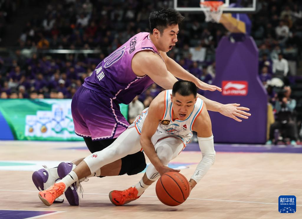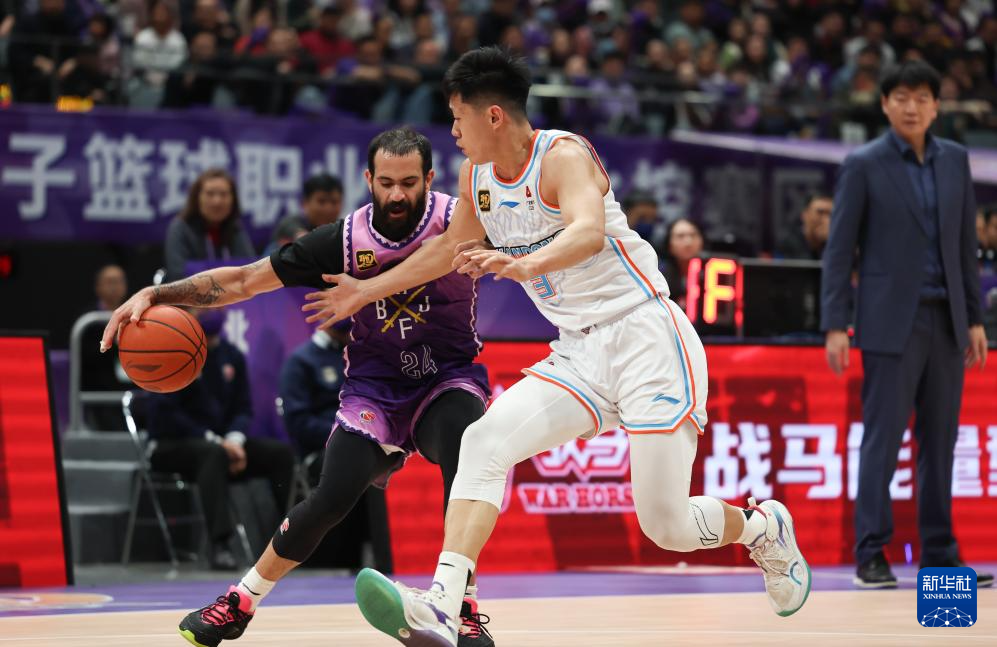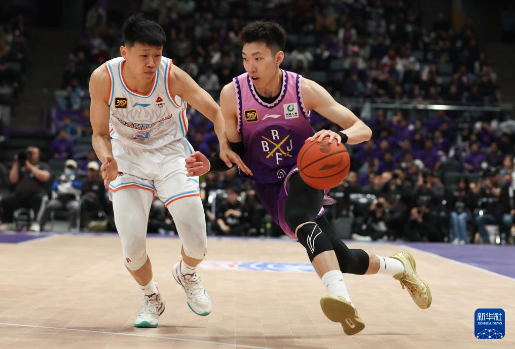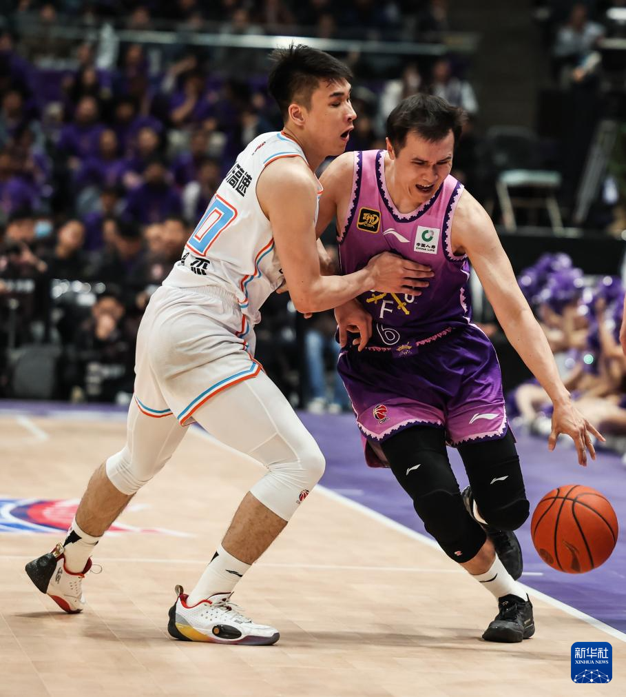 4月8日,北京控股队球员张帆(右)在比赛中突破。