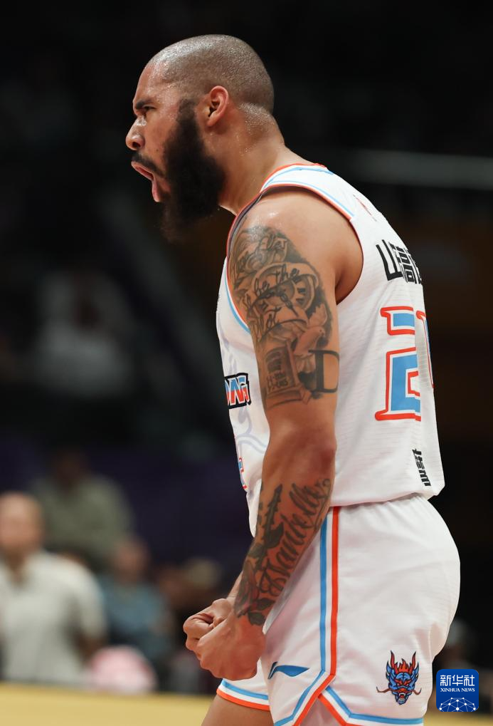 4月8日,山东高速队球员摩尔在比赛中庆祝得分。