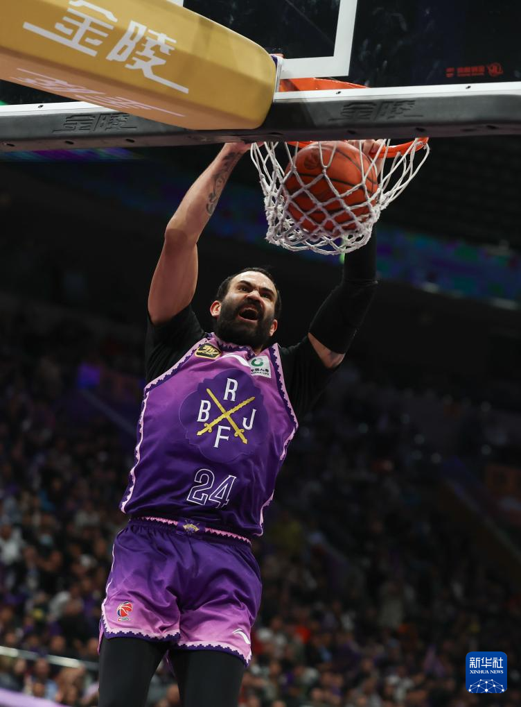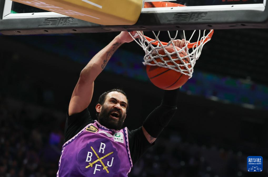 4月8日,北京控股队球员里勒在比赛中扣篮。