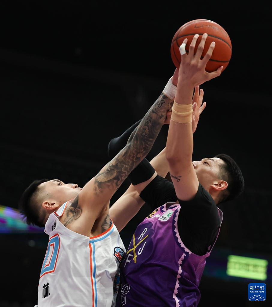 4月8日,北京控股队球员沈梓捷(右)在山东高速队球员陶汉林的防守下上篮。