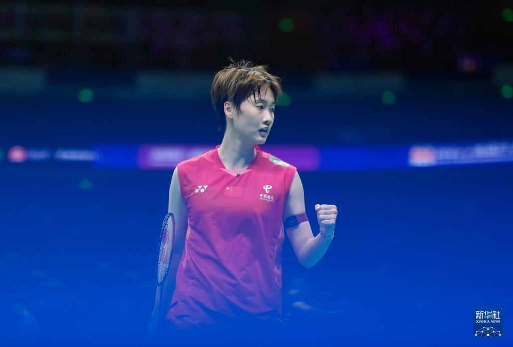4月9日,陈雨菲在比赛中庆祝得分。