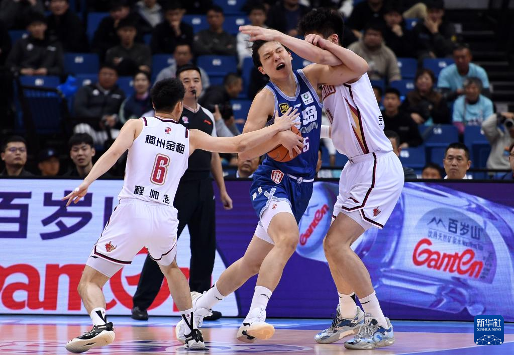 4月10日,浙江稠州金租队球员程帅澎(中)在比赛中持球进攻。