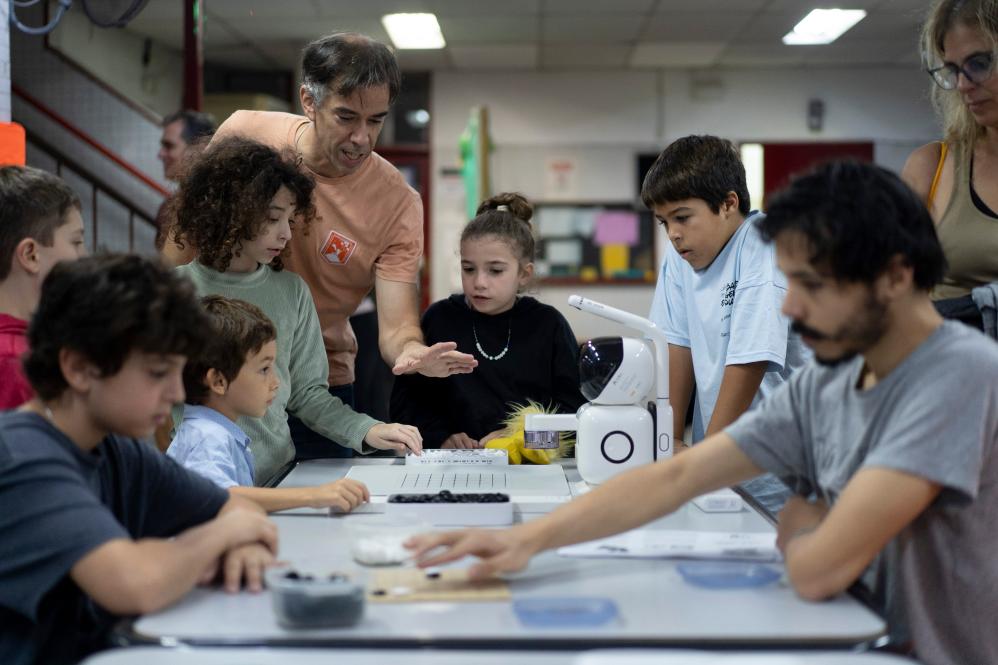 4月12日,阿根廷围棋协会主席圣地亚哥·拉普拉涅(中)在利用机器人教授学生们学习围棋。新华社发(马丁·萨巴拉摄)