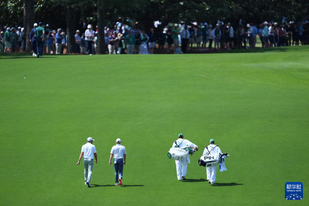 4月12日,罗里·麦克罗伊(左二)与同组的加拿大选手科里·康纳斯(左一)开球后走向落点。