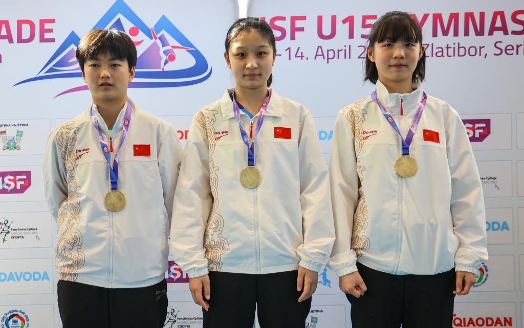 4月12日,冠军中国队选手杨丛溪、蒋思涵、周昱含(从左至右)在颁奖仪式上。当日,在2025年U15世界中学生夏季运动会乒乓球女子团体决赛中,中国队战胜伊朗队,获得冠军。新华社发(普雷德拉格·米洛萨夫列维奇摄)