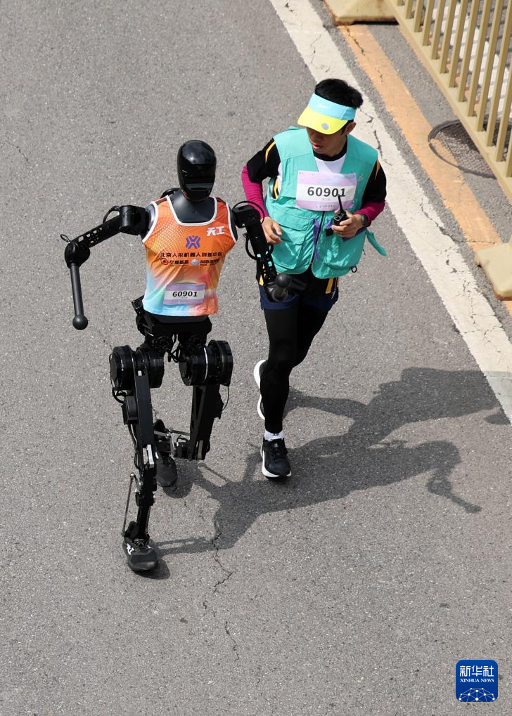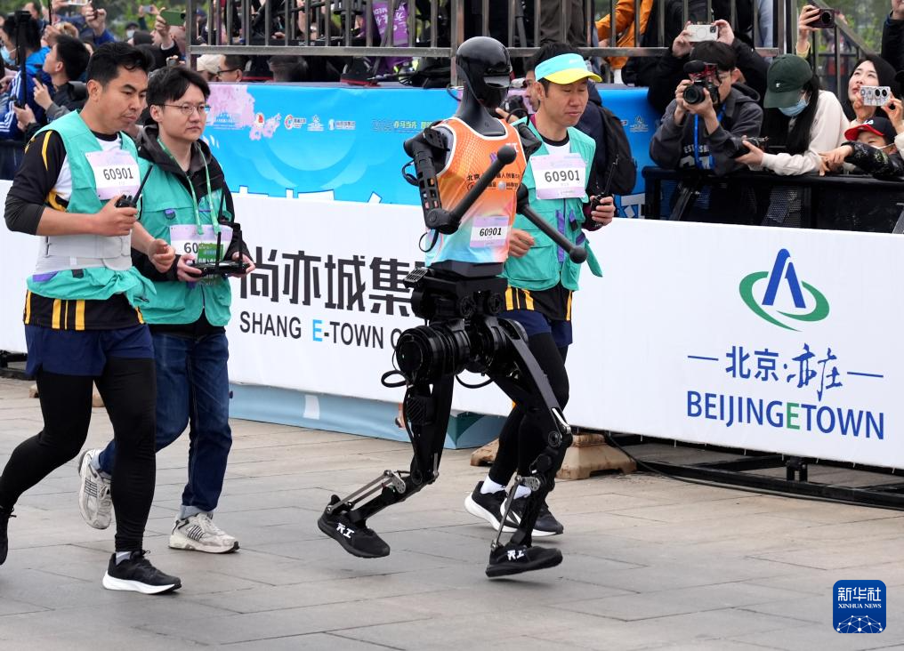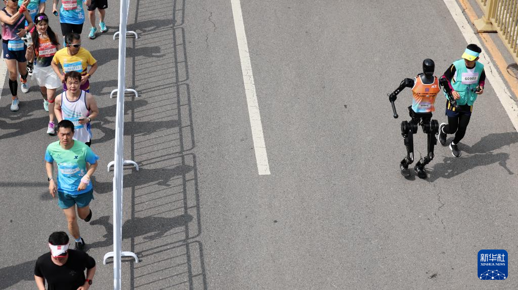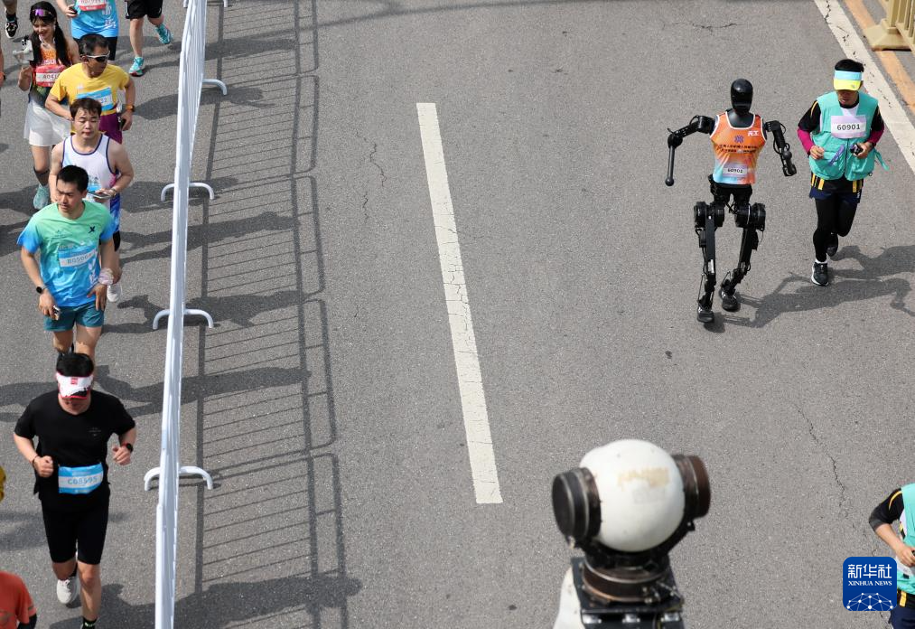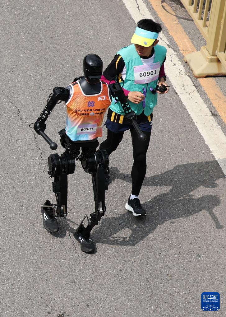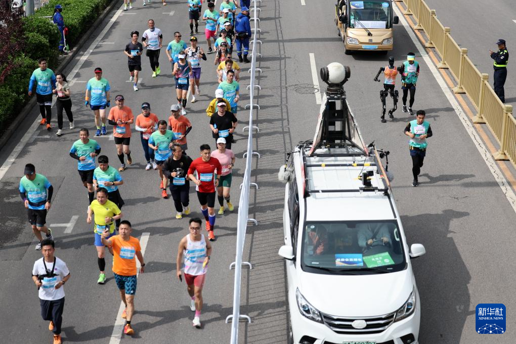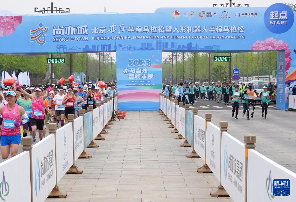 4月19日,参赛选手与人形机器人共同冲出起跑线。