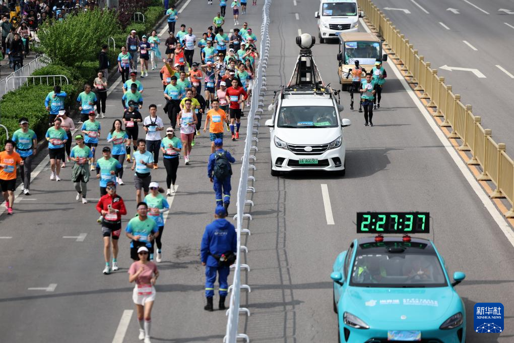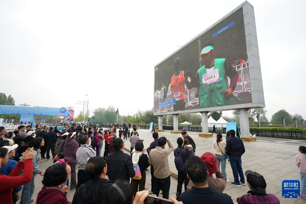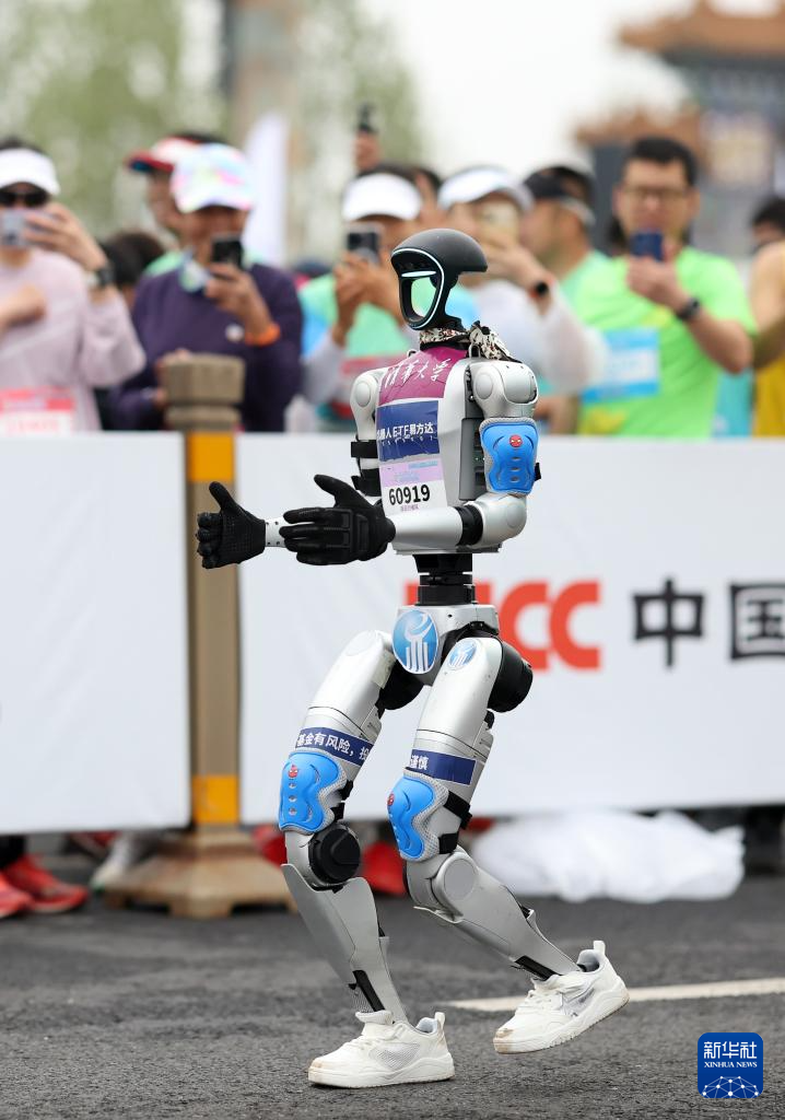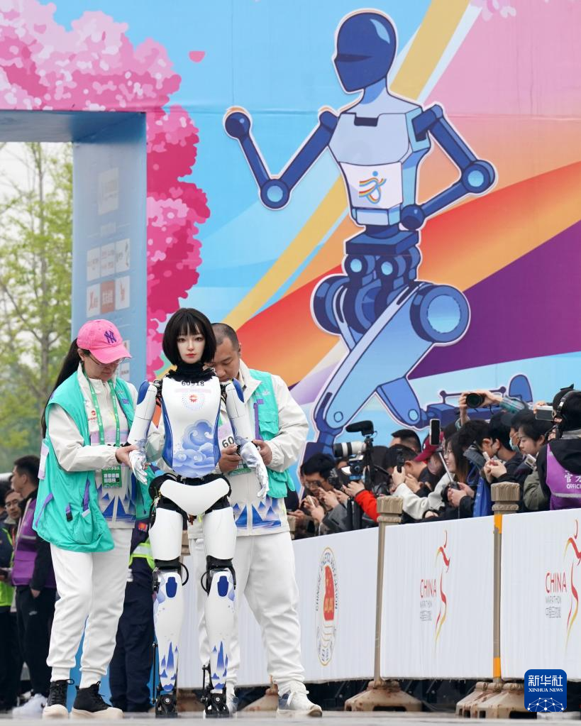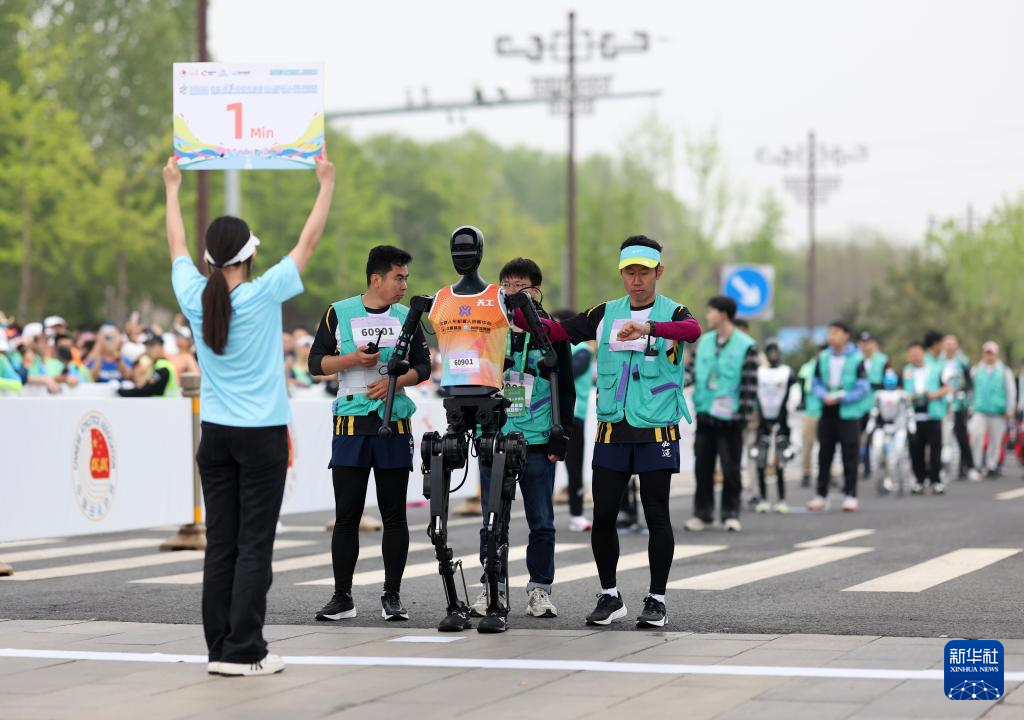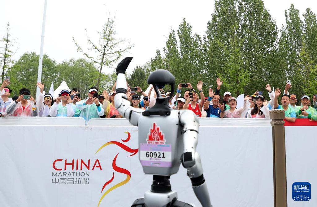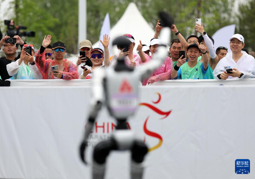 4月19日,参赛选手与人形机器人共同冲出起跑线。