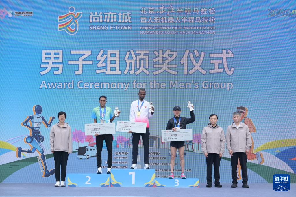 4月19日,2025北京亦庄半程马拉松男子组冠军埃塞俄比亚选手沃尔德哈瓦里亚特·德斯塔(左三)、亚军埃塞俄比亚选手图鲁·亚雷德·德梅克(左二)和季军中国选手孙晓阳(右三)在颁奖仪式上。