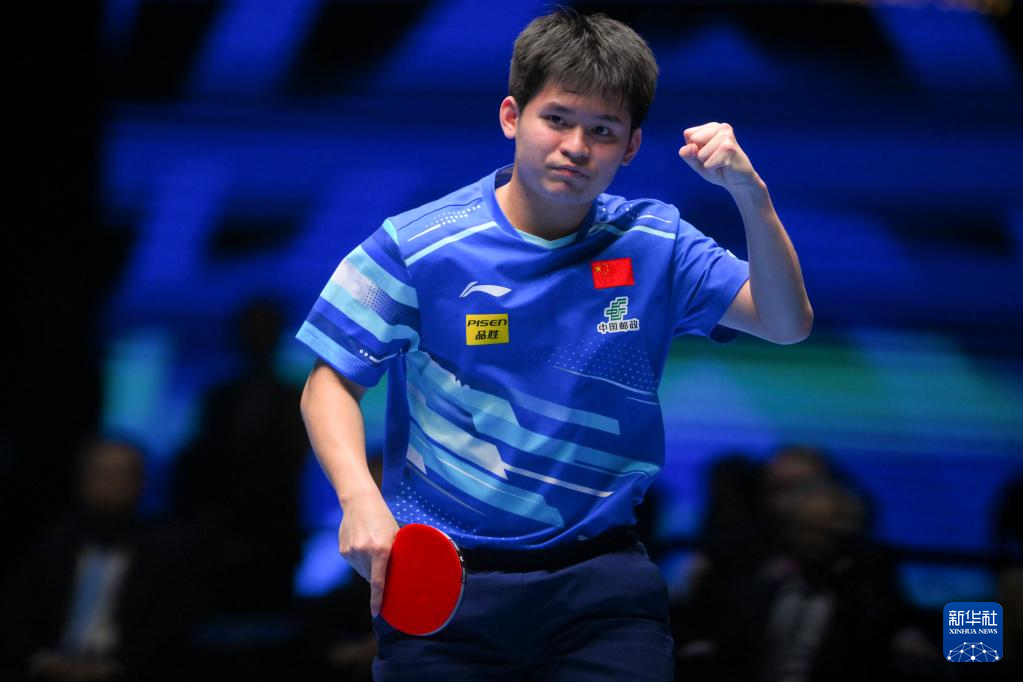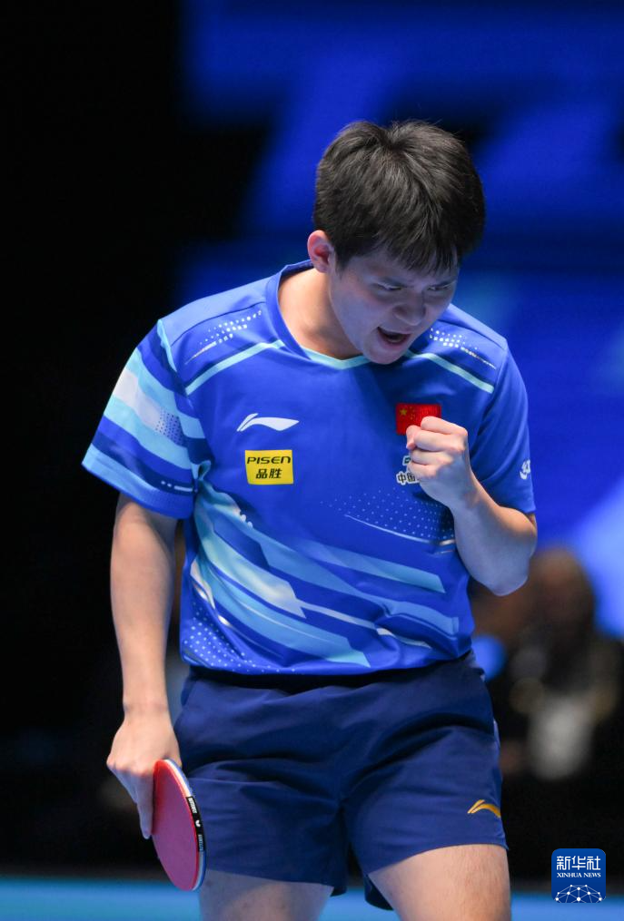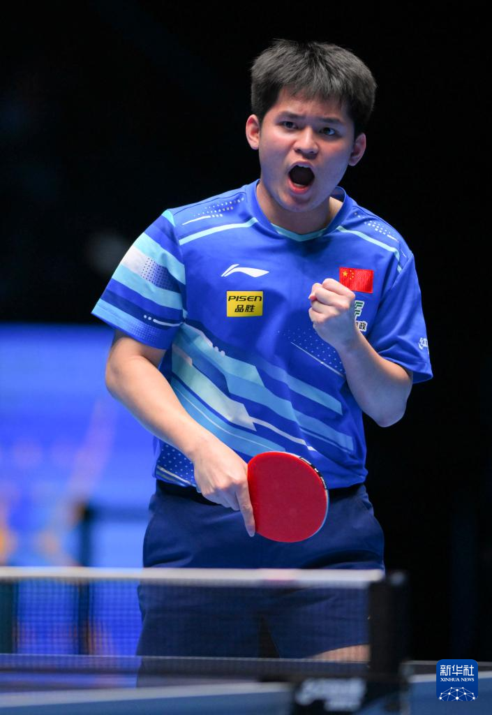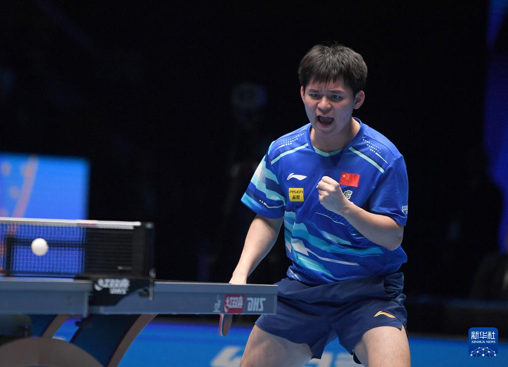 4月20日,林诗栋在比赛中庆祝得分。