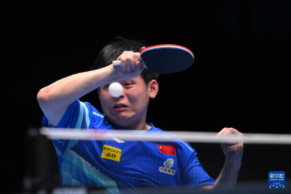 4月20日,林诗栋在比赛中回球。