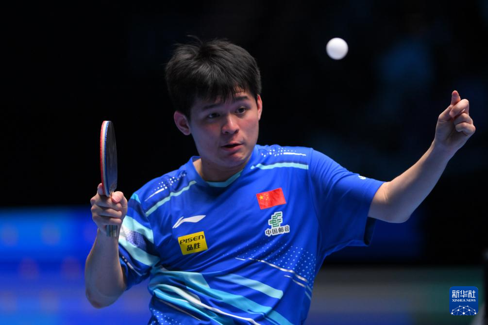 4月20日,林诗栋在比赛中发球。