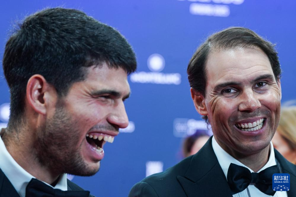 4月21日,西班牙网球运动员阿尔卡拉斯(左)和纳达尔一同接受采访。