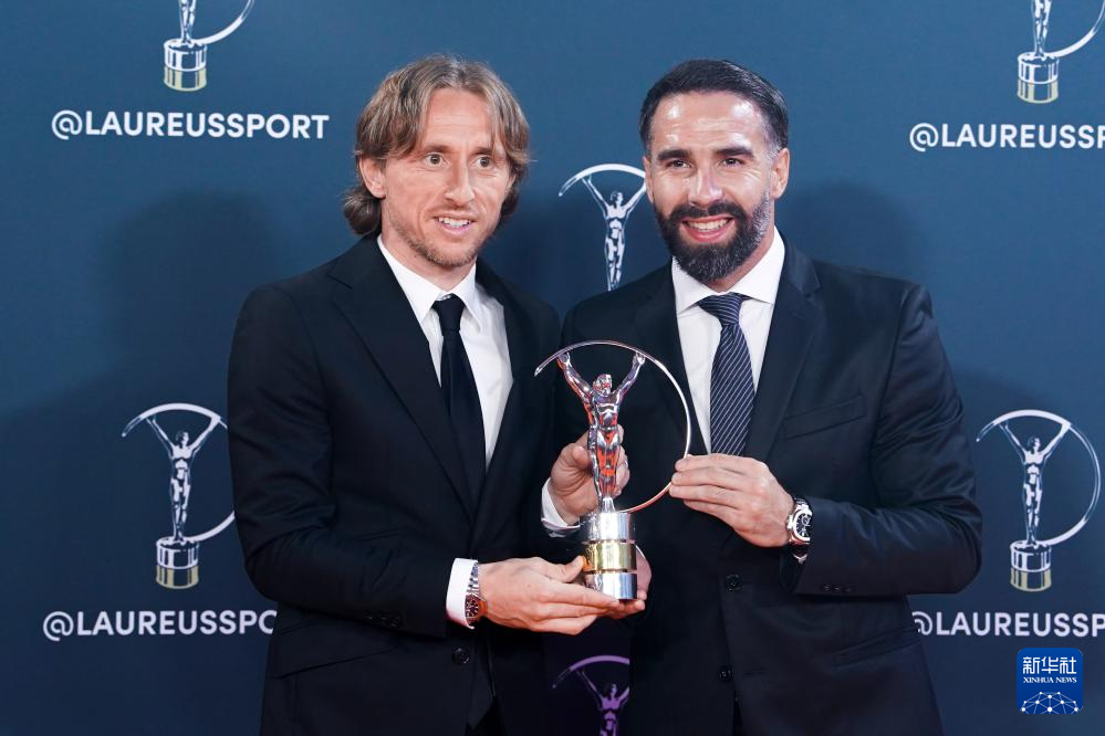4月21日,皇家马德里队球员莫德里奇(左)和卡瓦哈尔手捧奖杯合影,西班牙皇家马德里男足获得年度最佳团队奖。