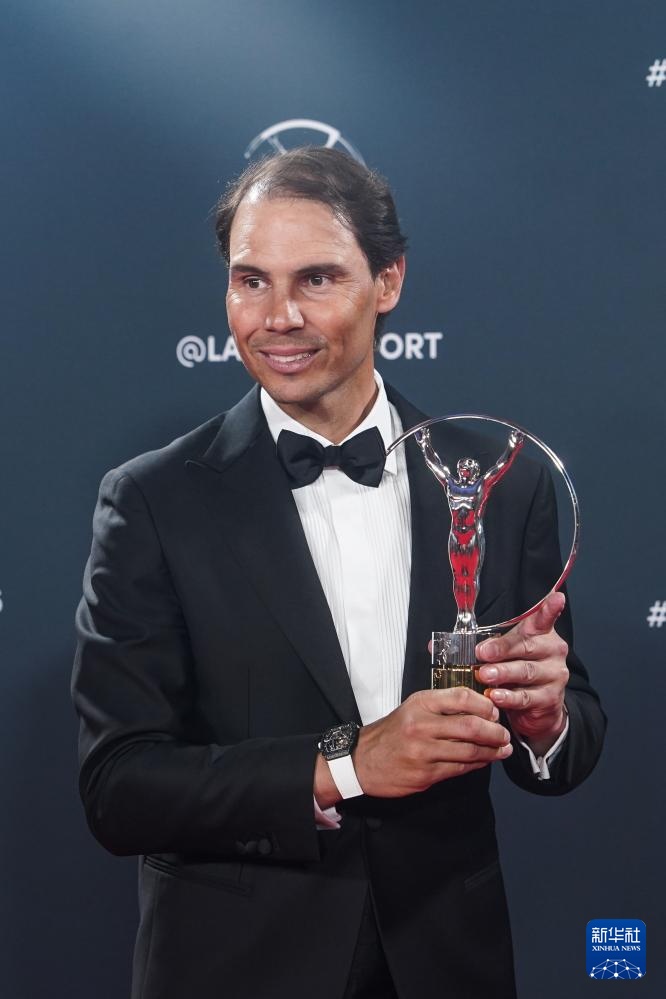 4月21日,获得体育传奇奖的西班牙网球名宿纳达尔手捧奖杯留影。