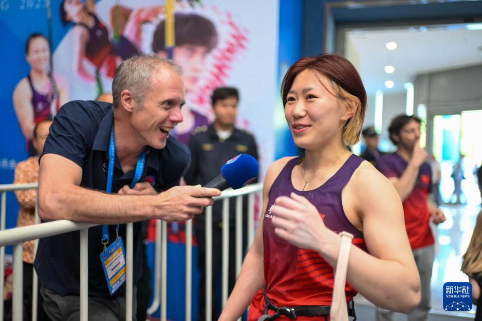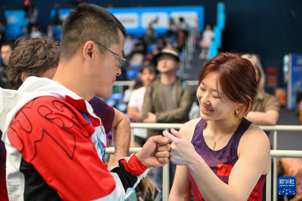 4月25日,中国选手张悦彤(右)在女子难度赛资格赛后与国家攀岩队领队助理王庆福碰拳。