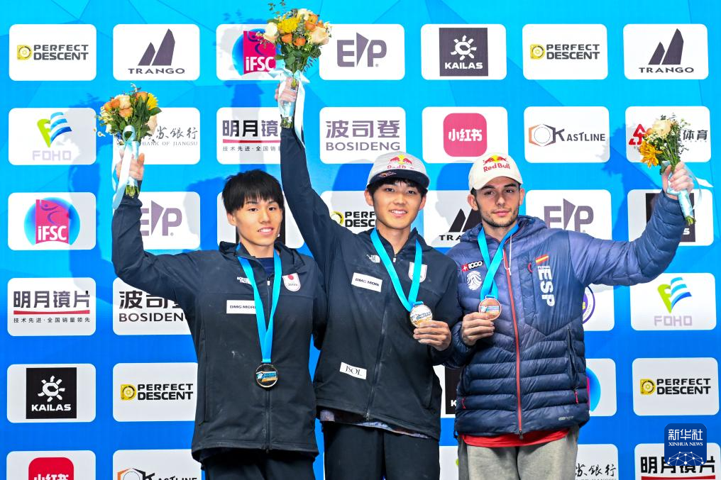 4月27日,冠军日本选手安乐宙斗(中)、亚军日本选手铃木音生(左)与季军西班牙选手阿尔韦托·希内斯·洛佩斯在颁奖仪式后合影。
