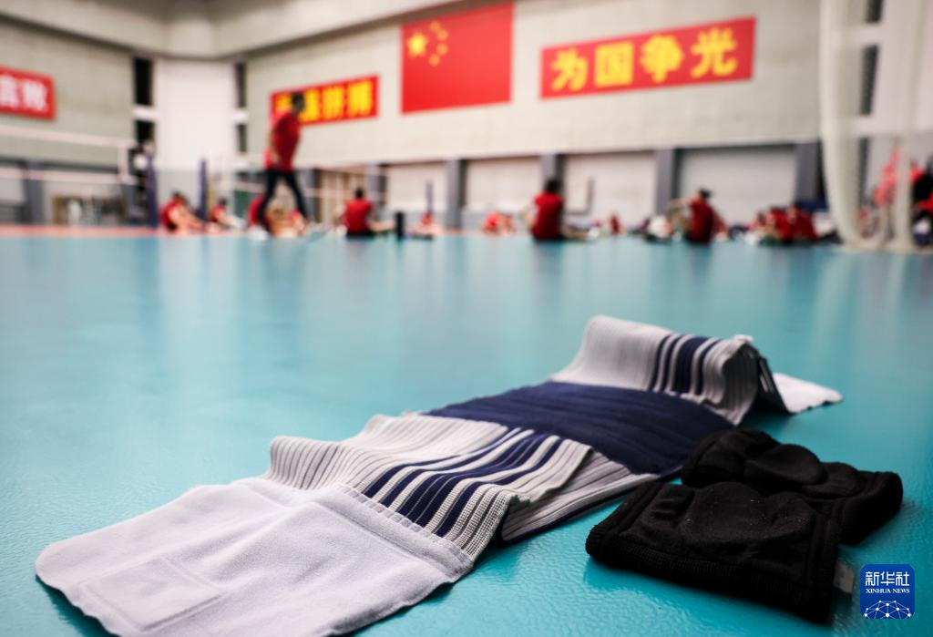 4月28日,中国女排队员将护具放在训练场边。