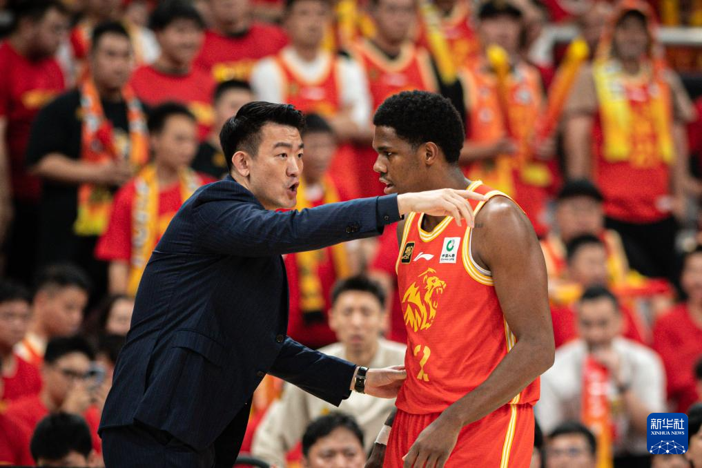 4月28日,浙江方兴渡队主教练王博(左)在比赛中指导球员奈特。