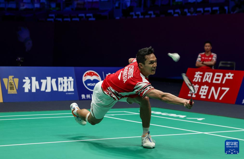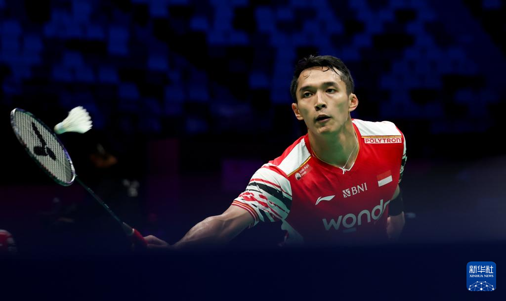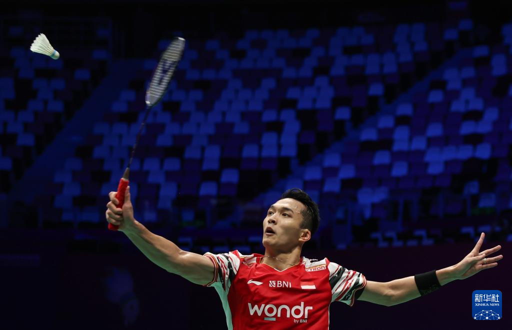 4月29日,印度尼西亚队选手乔纳坦·克里斯蒂在男单比赛中回球。最终,他2比1战胜印度队选手普兰诺伊。