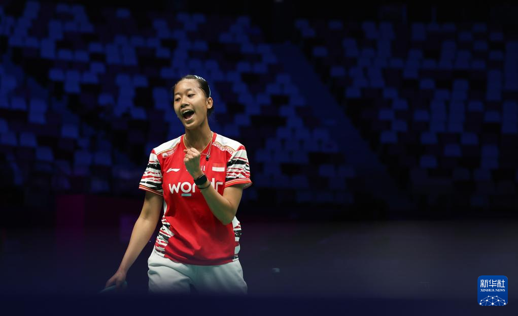 4月29日,印度尼西亚队选手瓦尔达尼在女单比赛中庆祝得分。最终,她2比0战胜印度队选手辛杜。