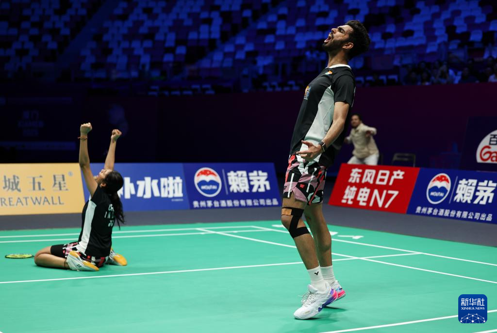 4月29日,印度队组合卡皮拉(右)/克拉斯托在混双比赛获胜后庆祝。最终,他们2比1战胜印度尼西亚队组合库沙尔扬托/维德佳佳。
