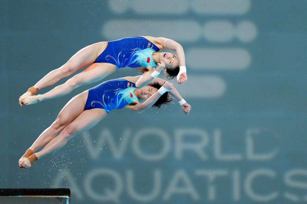 5月2日,获得2025年跳水世界杯总决赛女子双人10米台冠军的中国组合陈芋汐(右)/全红婵在颁奖仪式上。新华社记者 鞠焕宗 摄