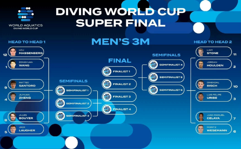 决赛阶段,4名选手必须完成完整的跳水清单(男子6个动作),从零开始计算成绩。