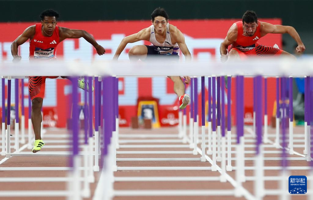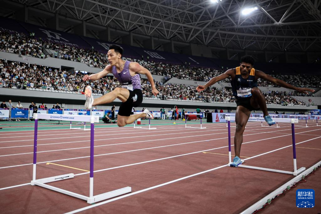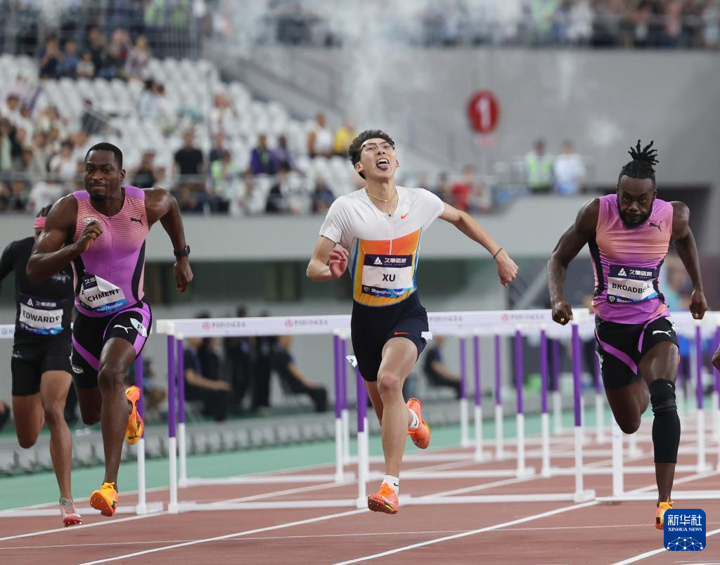 5月3日,中国选手徐卓一(中)在男子110米栏比赛中冲过终点线。他获得第四名。