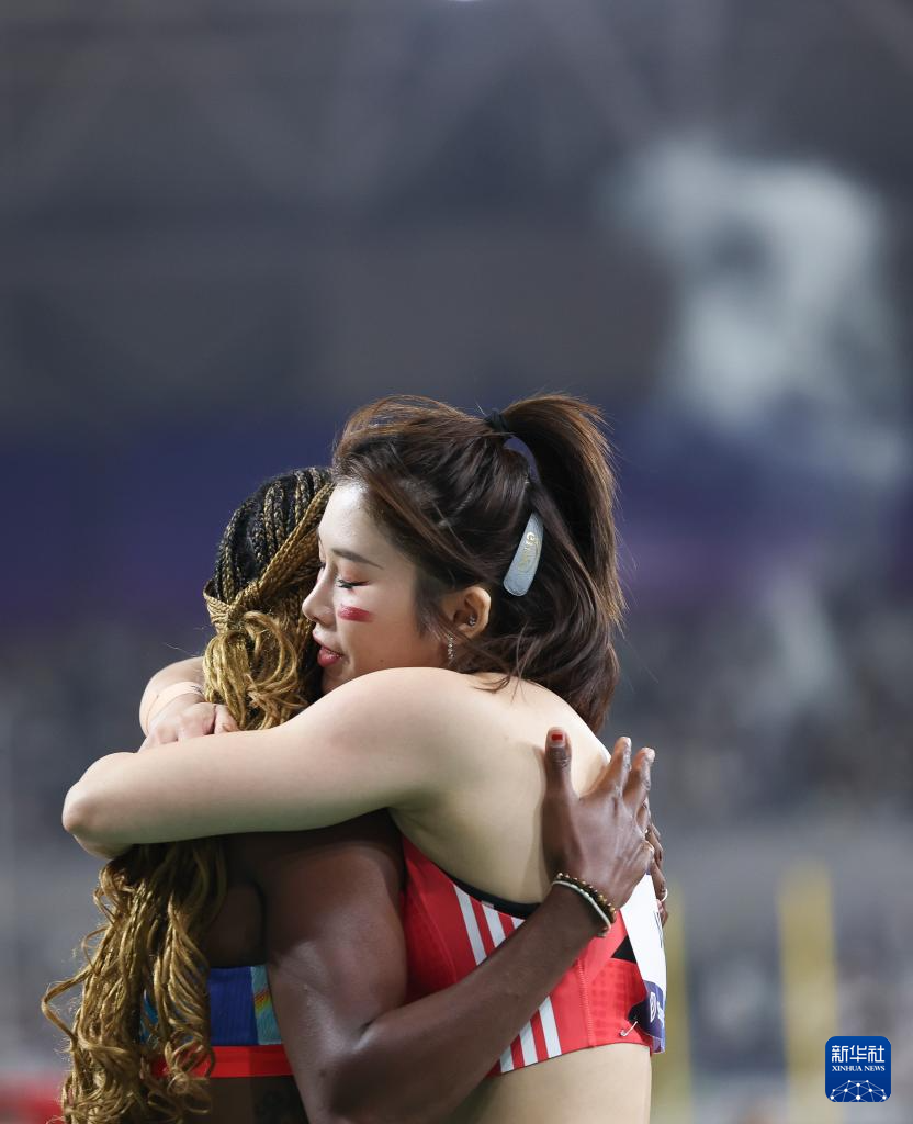 5月3日,中国选手吴艳妮(右)在女子100米栏比赛后与美国选手阿里拥抱。她们分获第八、九名。