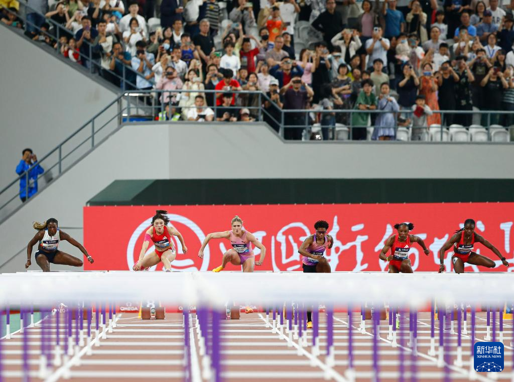 5月3日,中国选手吴艳妮(中)在女子100米栏比赛中。她以12秒96的成绩获得第八名。