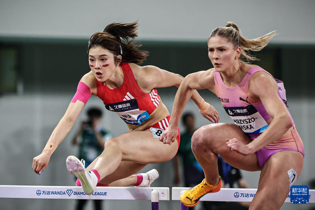 5月3日,中国选手吴艳妮(左)在女子100米栏比赛中。她以12秒96的成绩获得第八名。