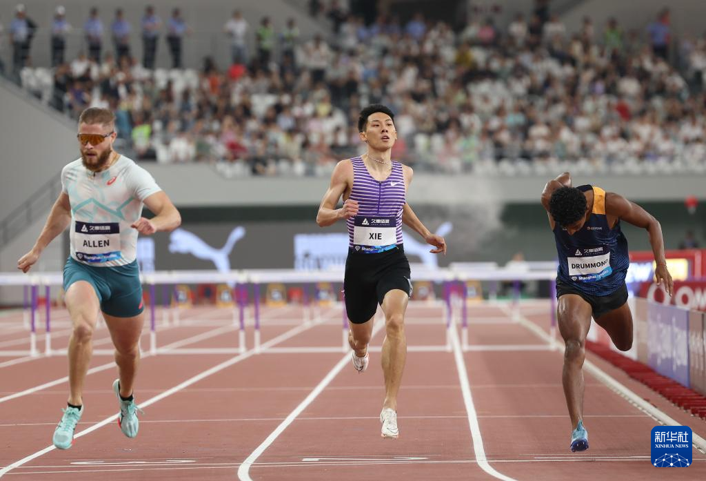 5月3日,中国选手谢智宇(中)在男子400米栏比赛中。他以49秒66的成绩获得第八名。