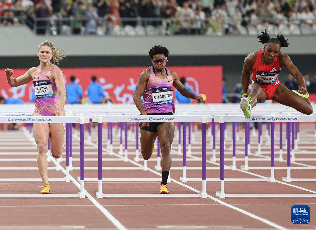 5月3日,美国选手斯塔克(右)在女子100米栏比赛中。她以12秒42的成绩获得冠军。