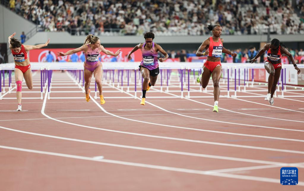 5月3日,美国选手斯塔克(右二)在女子100米栏比赛中冲过终点线。她以12秒42的成绩获得冠军。