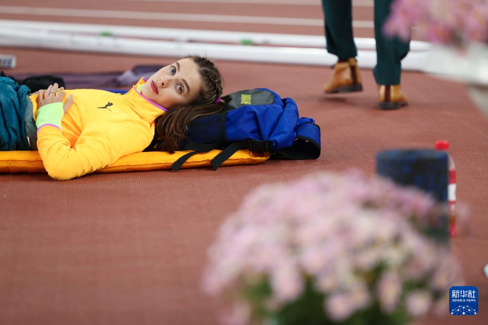 5月3日,乌克兰选手马胡齐克在女子跳高比赛间隙。她以2米00的成绩获得冠军。